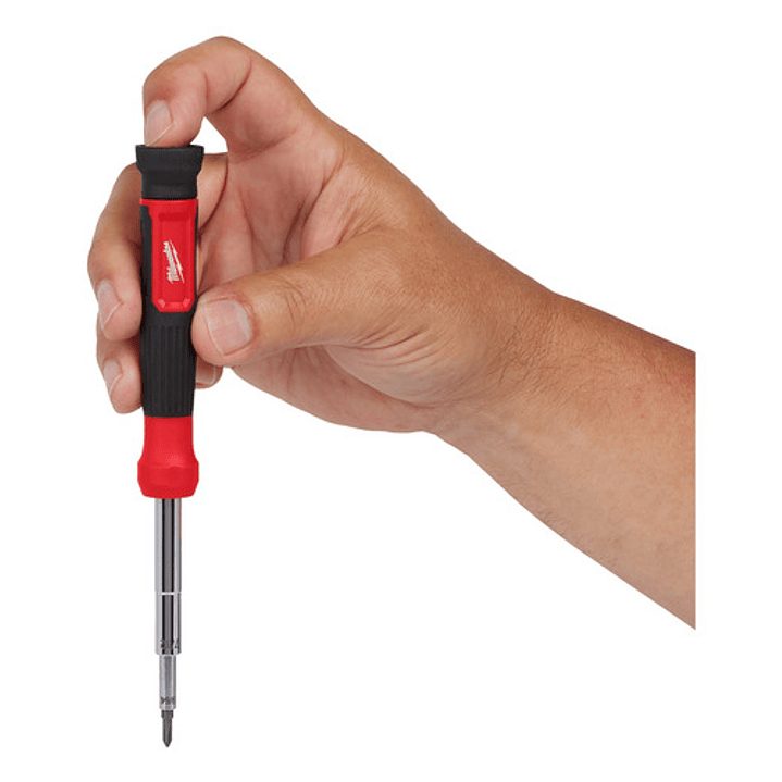 • 14 en 1: Incluye 4 puntas dobles que se esconden en el vástago (8 puntas distintas en total). Además, el vástago tiene 6 tomas hexagonales de distintas medidas que te servirán para aflojar tuercas o pernos.